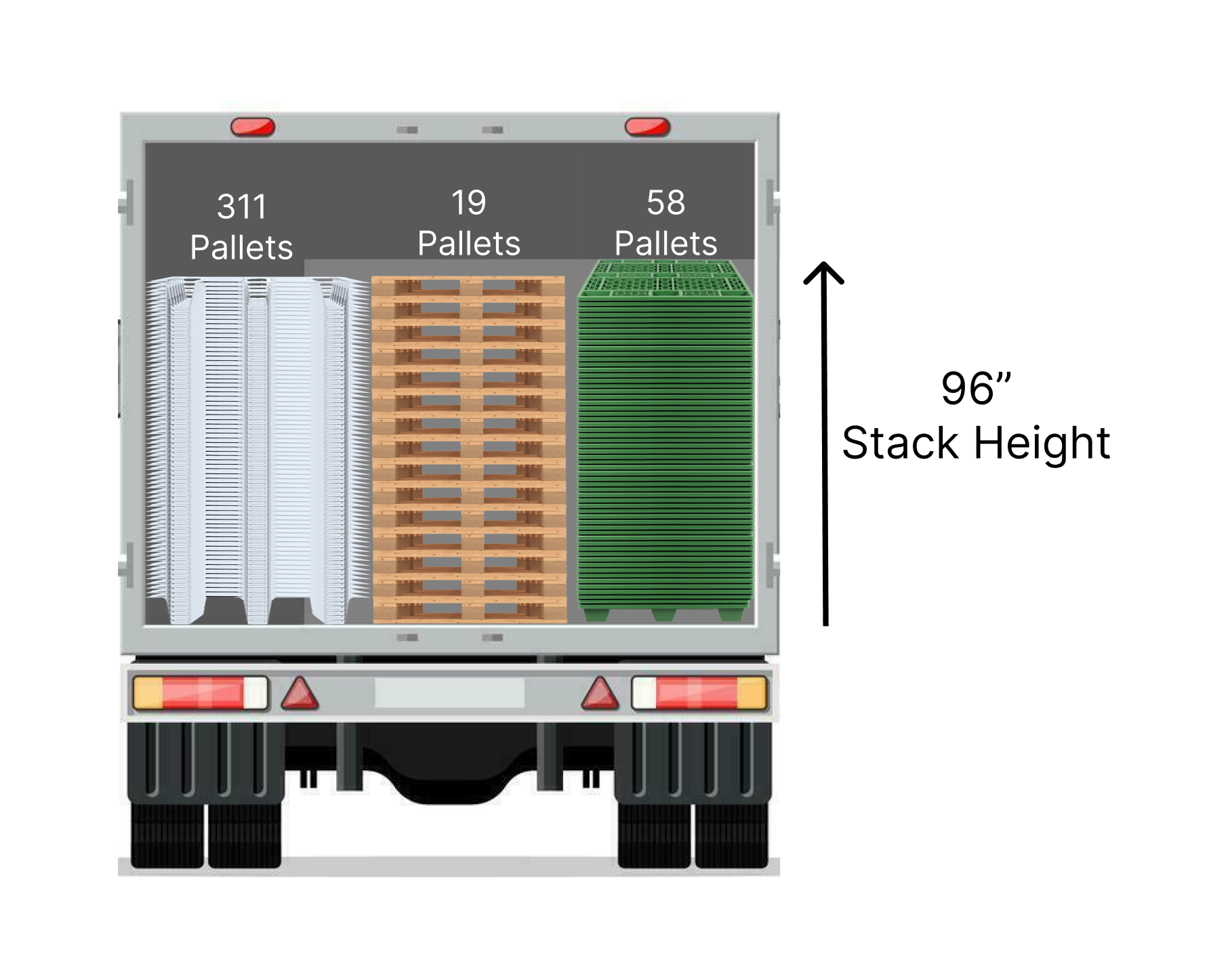 • Can transport hundreds more pallets for a similar price compared to the cost of shipping plastic and wood pallets.